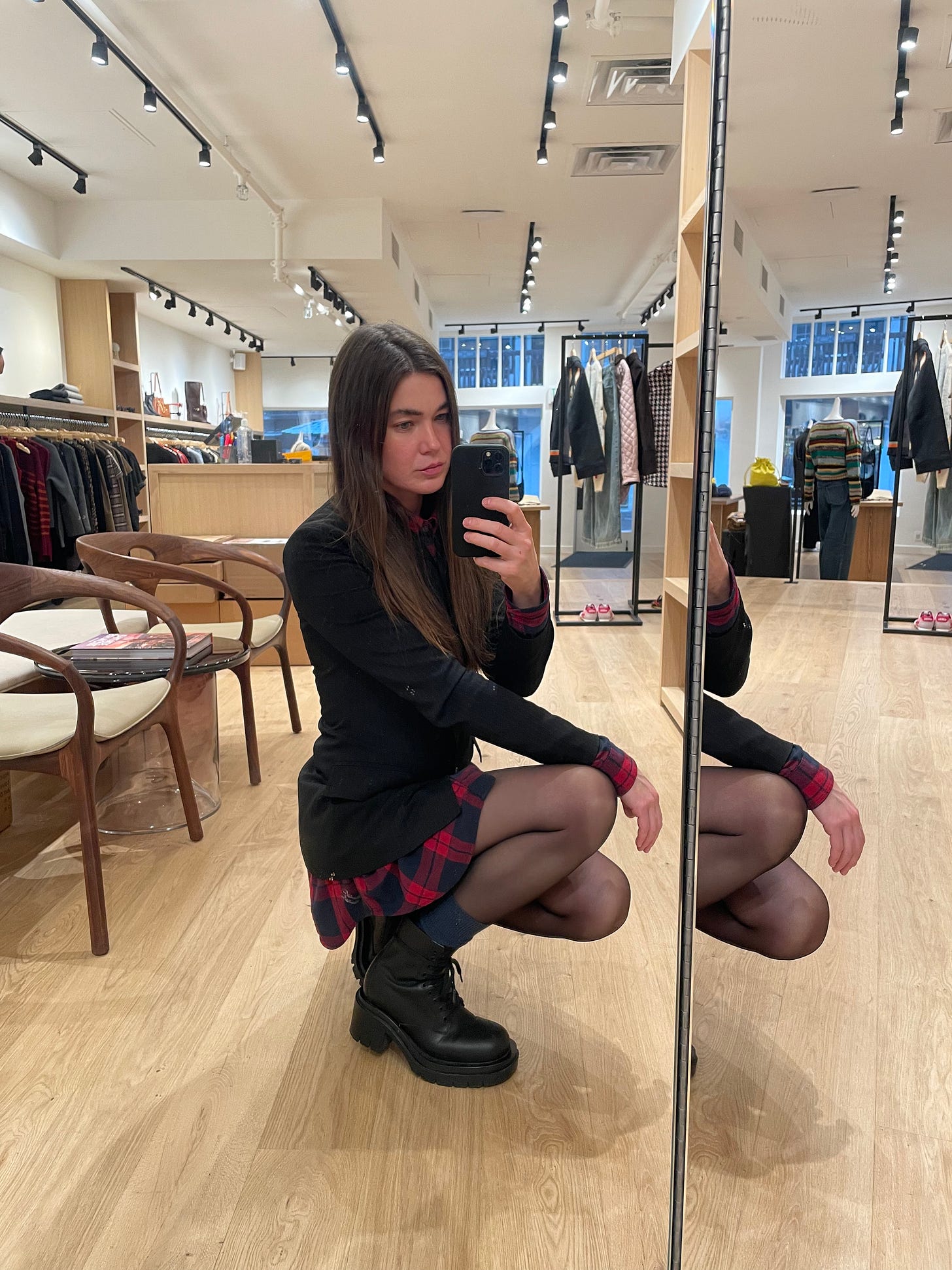 To no ones surprise, I’m always in multiple layers of black. But it needs to be said that the red/blue plaid contrasts nicely with the blazer so that you’re able to appreciate both elements. I tend to also wear this blazer with a sheer black button up and while I love that combination as well, it’s not quite as eye catching (or as full of contrasting themes). Even the small detail of the navy socks peeking out against the black tights creates another subtle variance that helps support the overall message.